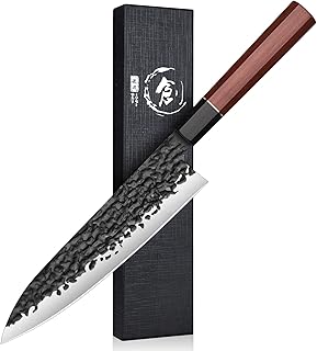 Das Gyuto Messer ist das japanische Pendant zum westlichen Kochmesser und zeichnet sich durch seine Vielseitigkeit aus. Mit seiner leicht gebogenen Klinge eignet es sich hervorragend für die Wiegeschnitttechnik und bewältigt mühelos das Schneiden von Fleisch, Fisch und Gemüse. Die typischerweise dünnere Klinge im Vergleich zu westlichen Kochmessern ermöglicht präzisere Schnitte bei geringerem Kraftaufwand.